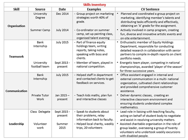 The Skills Inventory can be drawn up in a simple table, identifying the skill you possess, the source of the skill (where you acquired it), the date, examples of the skill and a CV sentence, the sentence you are going to write on your curriculum to explain it.